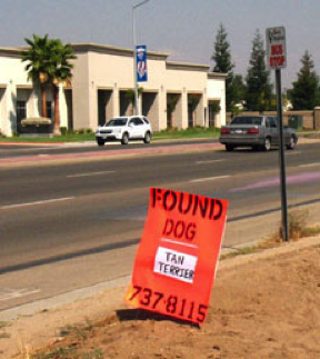 - If you belong to an organized rescue group or if you routinely encounter loose and stray dogs, you can actually pre-make florescent “FOUND DOG” signs and have them on hand for the next time you find a dog. You can also affix them (with duct tape on the back) to recycled campaign signs made with a wire “A” frame. These signs are reusable and if there isn’t a telephone pole nearby, you can simply stick the signs into soft dirt next to a busy roadway and get your message out to many drivers passing by.